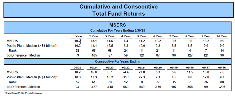 Defined Benefit Michigan State Employee Retirement System (MSERS) – SMIB reported on the total fund returns as shown in the “Cumulative and Consecutive Total Fund Returns” chart. Over longer time periods, the returns are higher than peer median returns. Peers are defined as the State Street Universe of public pension plans larger than $10 billion.