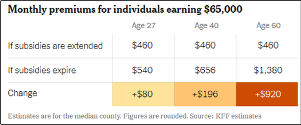 - Expensive Markets – For individuals living in the most expensive markets, the premium increase could be really significant. A 60-year-old individual living in southern Illinois, will see premiums increasing from $400 a month with subsidies, to $2,800 a month without. In addition, people living in rural areas pay higher premiums. Fewer than 10 percent of ACA customers make $65,000 or more according to KFF.